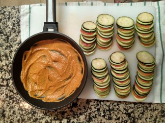 2. Talleu a rodanxes uniformes de 2 mm els carbassons, les esbergínies i els tomàquets. Millor si pot ser amb l’ajut d’una mandolina, excepte si els tomàquets son gaire tous. Procureu que el diàmetre de les rodanxes sigui el més homogeni possible. Reserveu–ne les puntes i les rodanxes que se us hagin trencat.