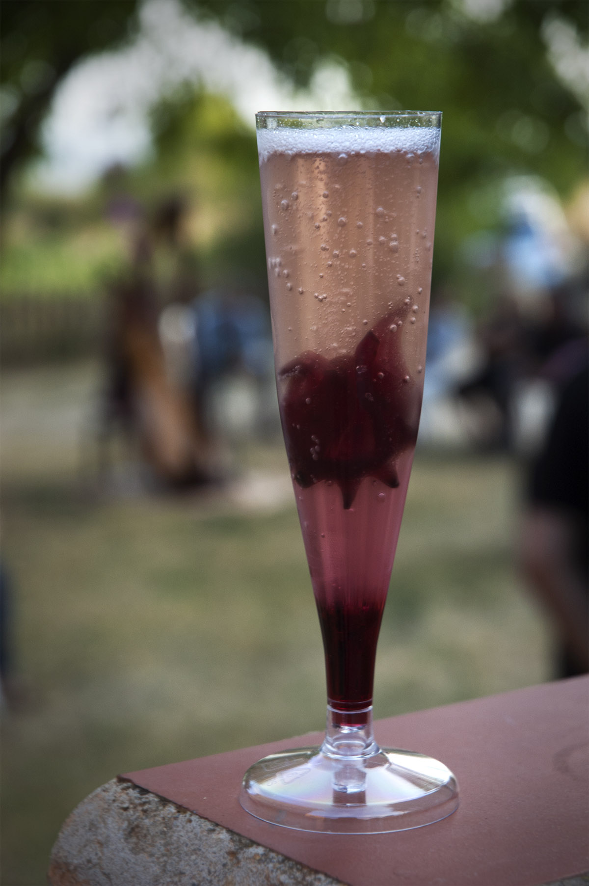 Després de demanar una mica d’assessorament, al Cocktailshop de Barcelona ens van proposar aquesta recepta. Es prepara amb flors de hibiscus en almívar (que es compren en conserva), i opcionalment, un xic de licor de litxi. És molt senzill de preparar, i el resultat és molt espectacular. A la festa va ser tot un èxit!!